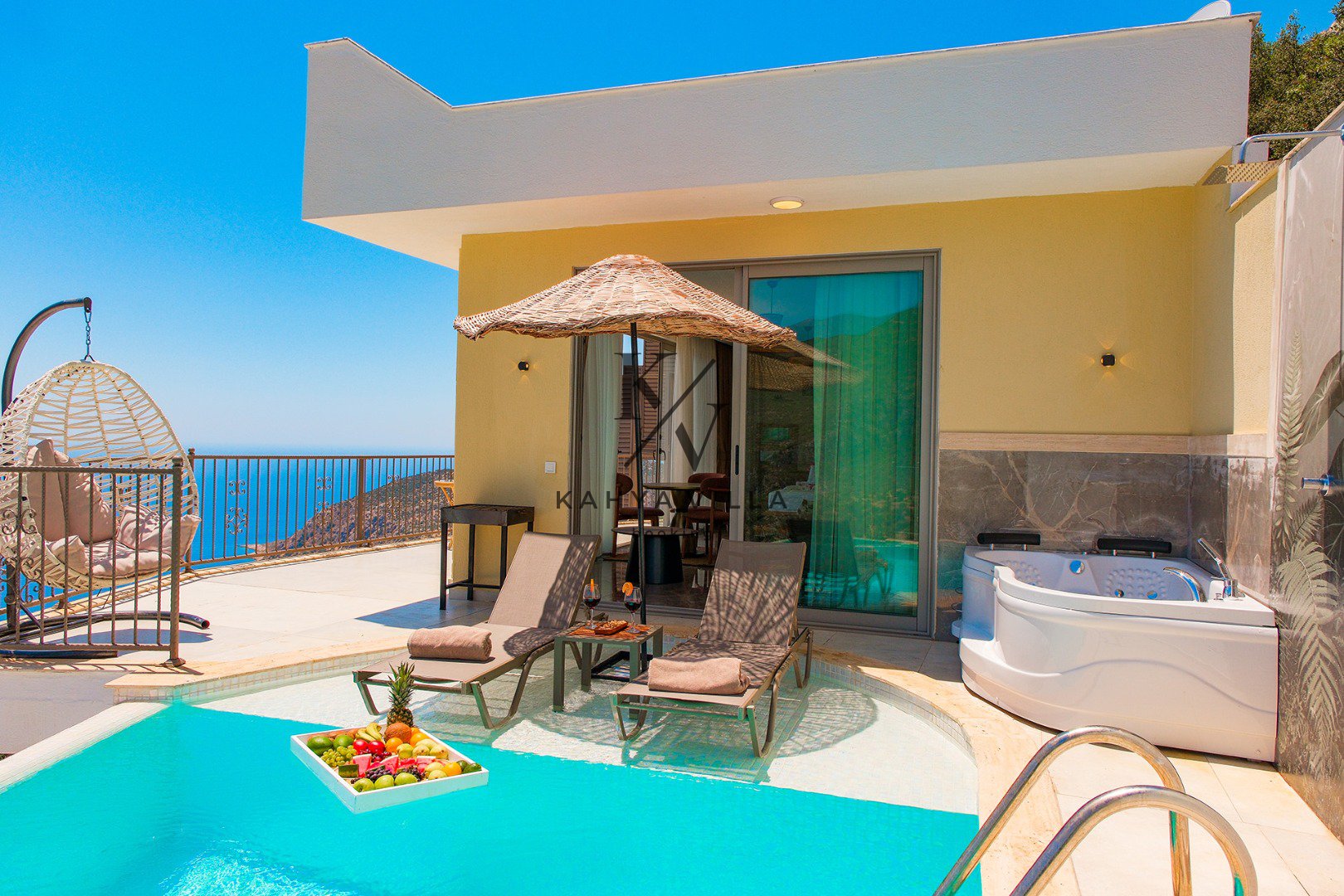 Eşsiz deniz manzarasına sahip bu özel balayı villasında, güne sonsuzluk havuzunuzda serinleyerek ve gökyüzüyle denizin birleştiği ufku izleyerek başlayabilirsiniz. Jakuzinizde günün yorgunluğunu atarken, ruhunuza dokunan o eşsiz huzuru hissedeceksiniz.