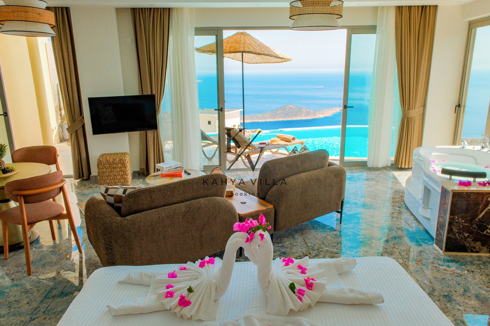 Eşsiz deniz manzarasına sahip bu özel balayı villasında, güne sonsuzluk havuzunuzda serinleyerek ve gökyüzüyle denizin birleştiği ufku izleyerek başlayabilirsiniz. Jakuzinizde günün yorgunluğunu atarken, ruhunuza dokunan o eşsiz huzuru hissedeceksiniz.